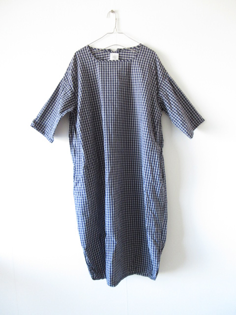 Gauze# (g):コットンリネン チェックスクエアネックワンピース F NAVY