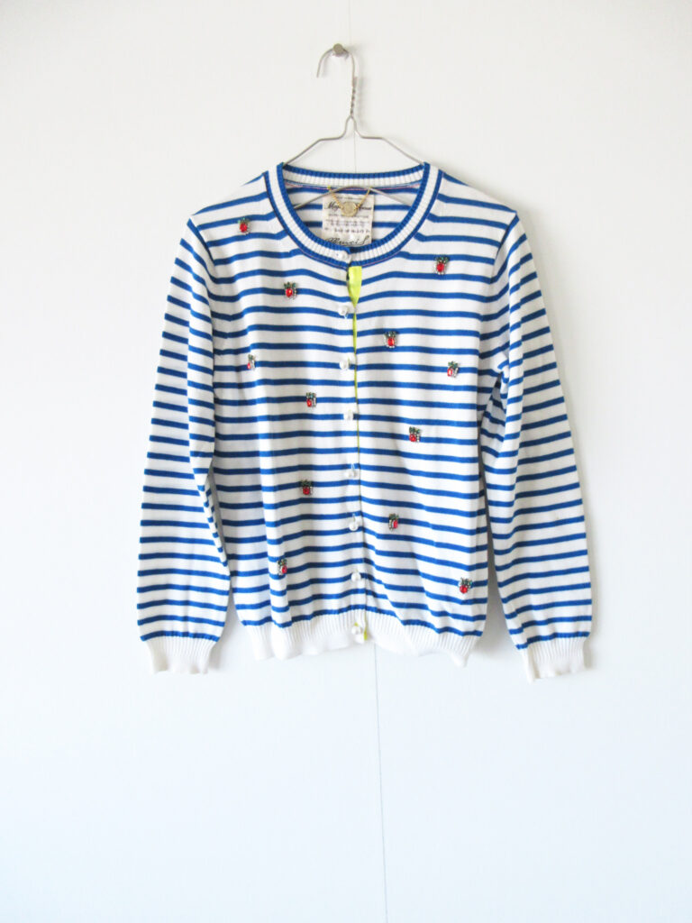MUVEIL:MA44KCD005 イチゴ刺繍ボーダーカーディガン 38 WHITE×BLUE